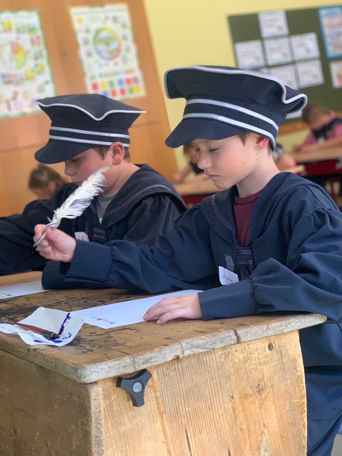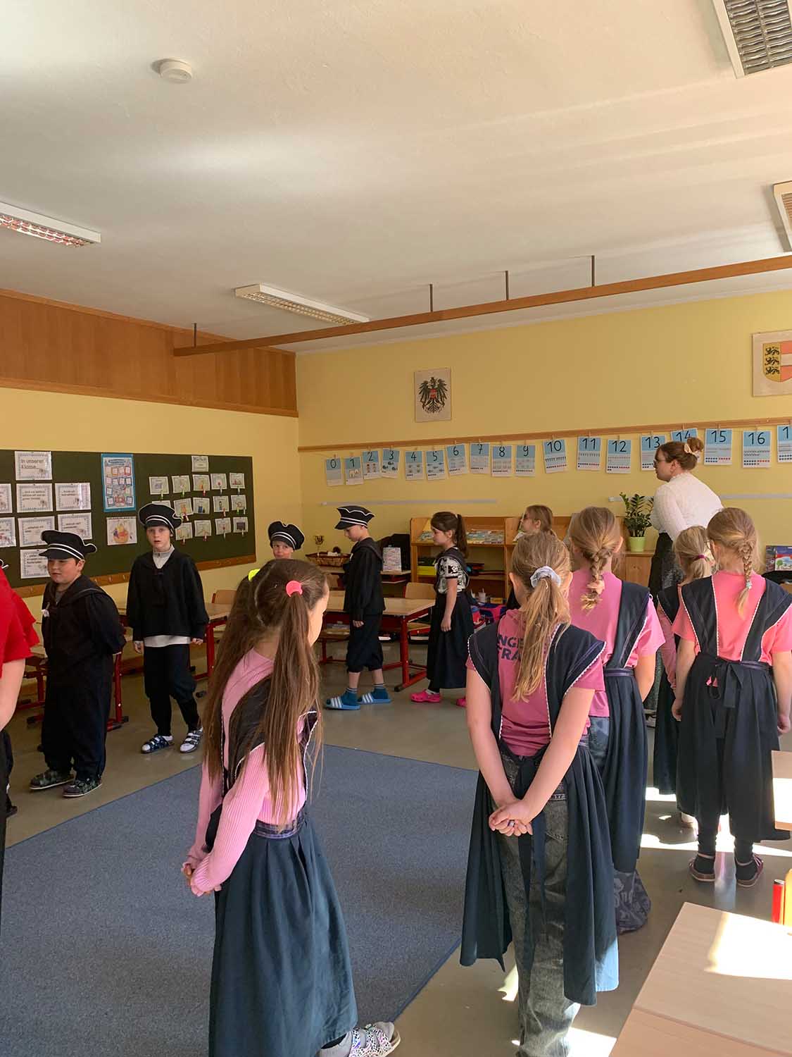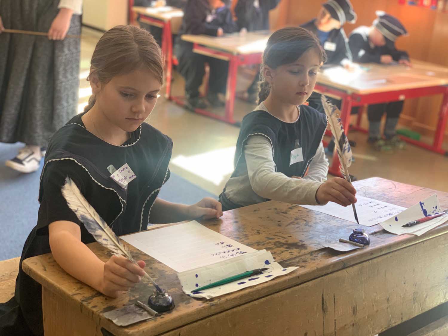 Zu Beginn hörten wir, wie der Schulunterricht vor 100 Jahren stattfand. Später durften wir sogar in Bekleidungsstücke schlüpfen, wie sie die Buben und Mädchen früher getragen haben. Auch mit Schiefertafel und Griffel durften wir schreiben. Die Gänsefeder mit Tinte wurden ebenfalls ausprobiert.
