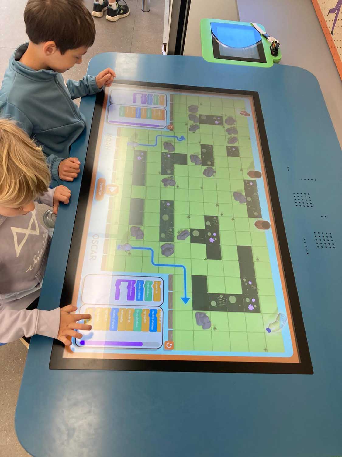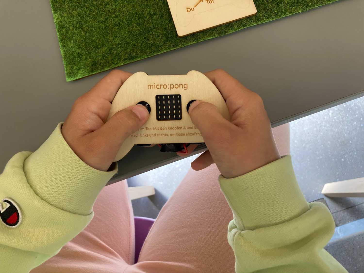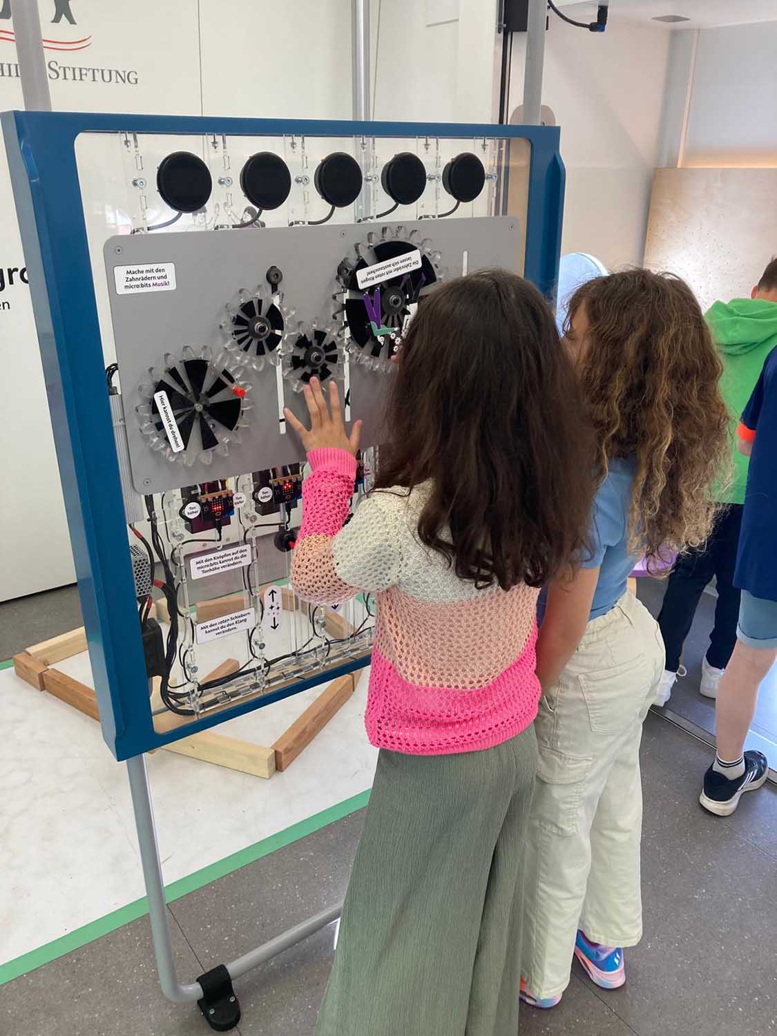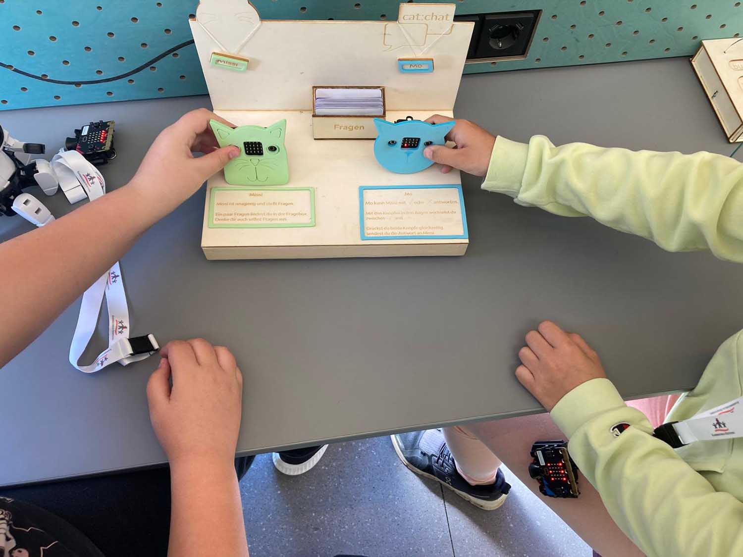 Nach einer informativen Einführung konnten an sieben verschiedenen Stationen unterschiedliche KI-Funktionen erprobt und Aufgaben bewältigt werden. Dazu zählten zum Beispiel ein einfach programmiertes, virtuelles Fußballspiel, die Pflege virtueller Pflanzen mittels programmierten Feuchtigkeits- und Lichtmessgeräten, das Komponieren von Liedern, das Erteilen von Befehlen an einen Roboter und das Erstellen von Bildern mithilfe von beleuchteten bzw. unbeleuchteten Feldern. Bei jeder dieser Stationen wurde der Spielfortschritt der Kinder auf sogenannten Micro Bits, die zu Beginn ausgegeben wurden, gespeichert. Gelöste Aufgaben ermöglichten es den Schüler:innen zudem, ihre virtuellen Roboter, die sich auf den Micro Bits befinden, zu designen.