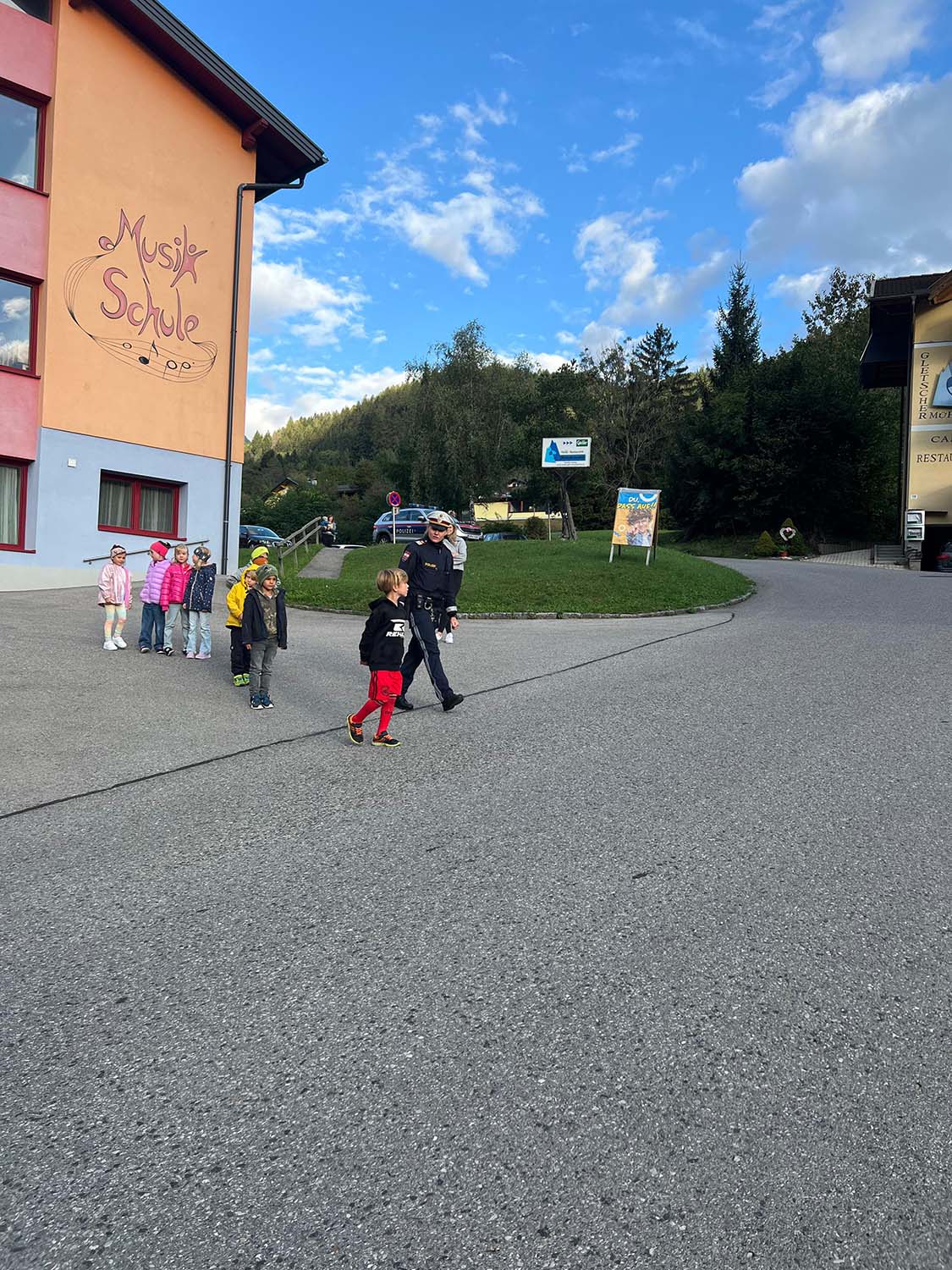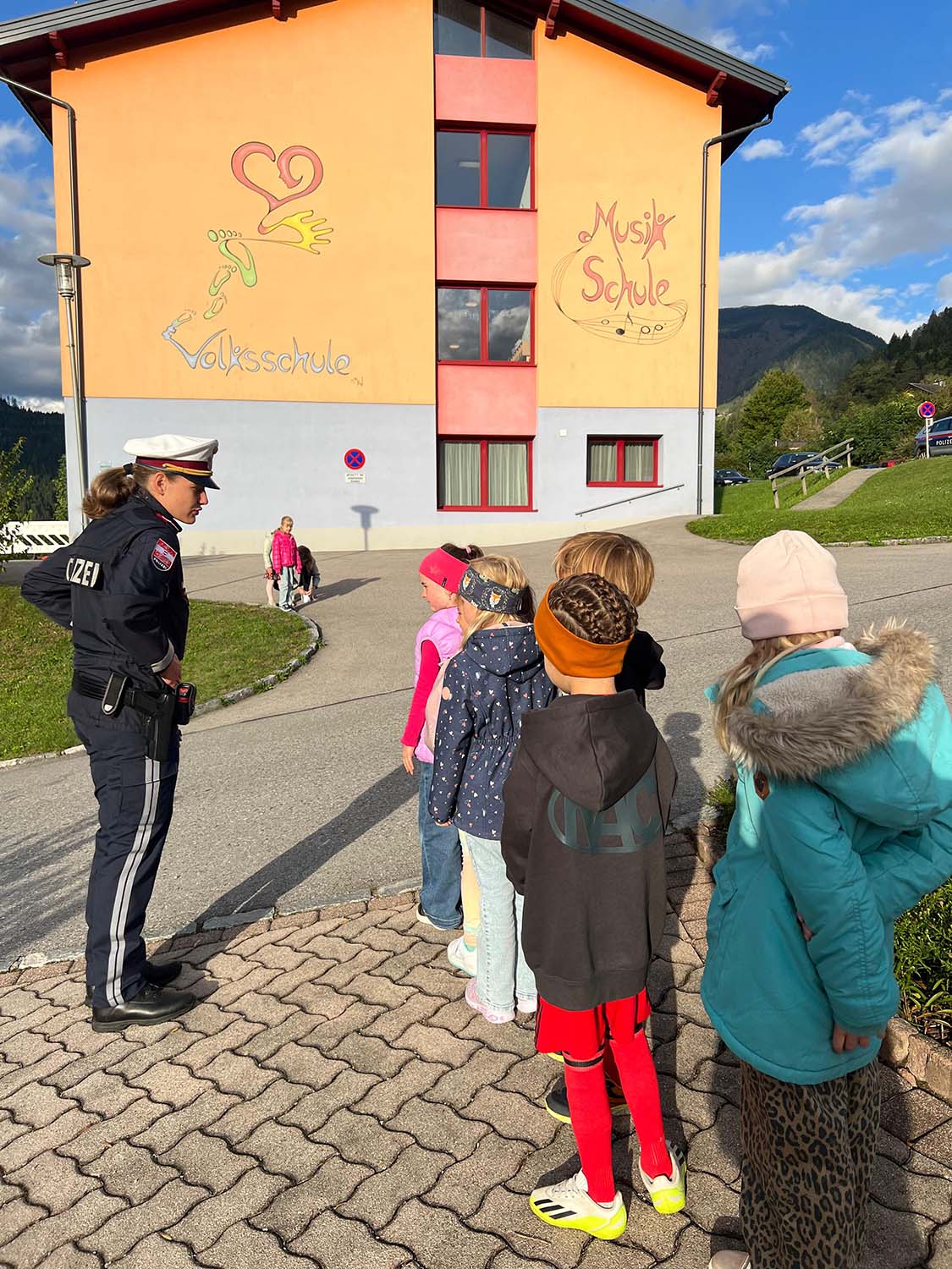 Heute bekamen unsere Schulanfänger Besuch von einer Polizistin, die mit ihnen über richtiges Verhalten im Verkehr, besonders am Schulweg, sprach. Natürlich wurde auch rund um unser Schulhaus geübt, wie man die Straße sich überquert und worauf man besonders achten soll! Die Erstklässler waren mit großem Interesse dabei!